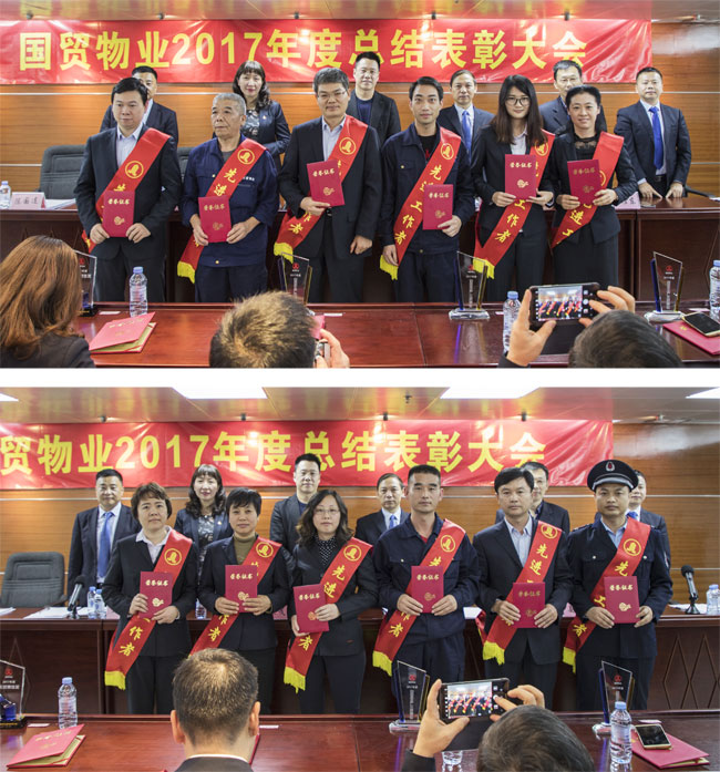 随后,党委书记王秋平宣读了《关于表彰二〇一七年度先进的决定》的文件,对获得2017年度的9个先进集体奖、3个安全生产单位、5个最佳收费奖、2个特殊贡献奖、2个道德风尚奖、5个工匠精神奖以及49个先进工作者进行表彰并颁奖。获得先进集体奖的代表华为项目部经理王前龙、获得先进工作者代表的行政事务部梁莉以及获得工匠精神奖的国贸大厦佘克军分别发表了获奖感言。