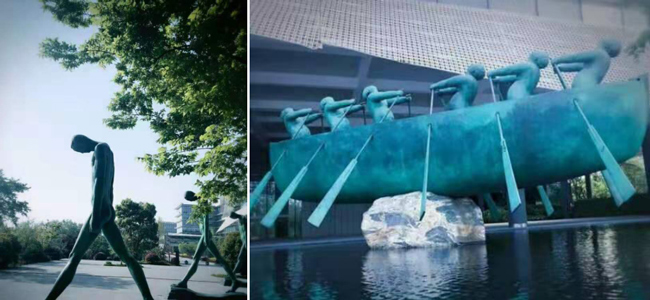 在考察过程中,国贸杭分办公室主任王时菁向黄海忠董事长一行人介绍了阿里园区代表性雕塑:三座赤身胴体男子形象头部低垂,迈大步前行,表示一群低头思索的少年,脚踏厚石,低头深思,迈开双腿,大步向前;愚人船雕塑两侧人员用相反的力摇浆,其含义是如果一个团队没有凝聚力,那么即使个人再聪明,也只会像这群愚人一样,奋力划船,却止步不前,说明了团队协作的重要性。园区内的雕塑是阿里文化的集中体现,国贸杭分助推阿里文化的发展,杭分公司也将进一步加强与阿里的合作,共同进步,共同发展。