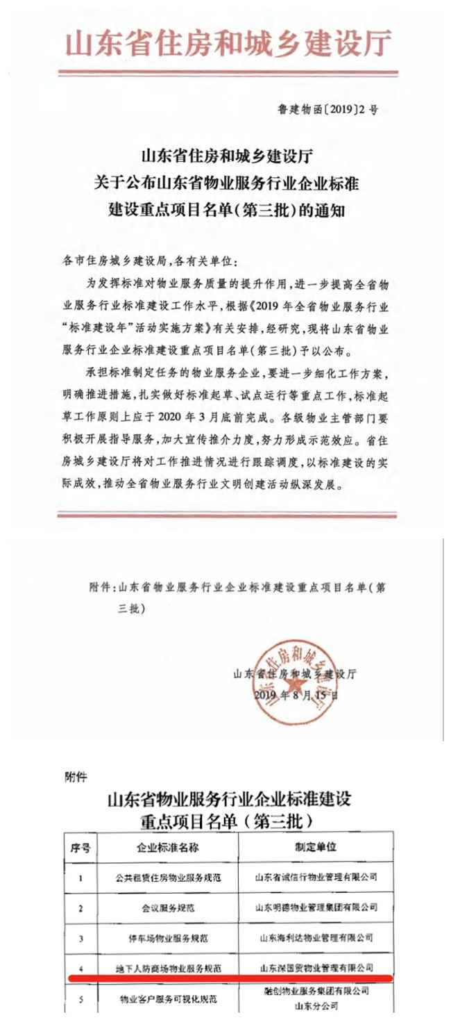 近日,在山东省住房和城乡建设厅公布的《山东省住房和城乡建设厅关于公布山东省物业服务行业企业标准建设重点项目名单(第三批)的通知》文件中,我司所提交的关于《地下人防商场物业服务规范》的标准成功入围。