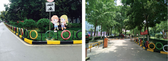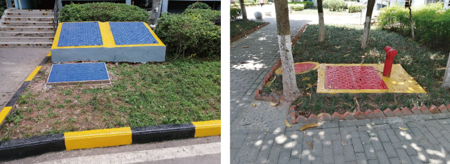 井盖和路沿石是颜色最鲜艳的部分,园区内每一个井圈外沿涂刷黄色漆,为区分不同井盖类别,我们依据其功能搭配颜色,绿色是雨水,黑色是污水,红色是消防,蓝色是通讯,路沿石则黄黑相间,五颜六色的,像极了一个个隐藏在小区的宝藏。