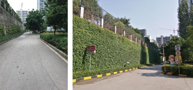 小区进门处有一面堡坎,隔开两江名居小学和小区,光秃秃的水泥墙面还有零零散散的排水洞,毫无生机和美感,为了改变这一现象,我司于2016年种植了一片爬山虎,如今已贴满整个墙面,绿意盎然,生机勃勃,住户们都说,进门看见一整片绿色,能掸去工作一天的烦恼,恢复轻松的状态。