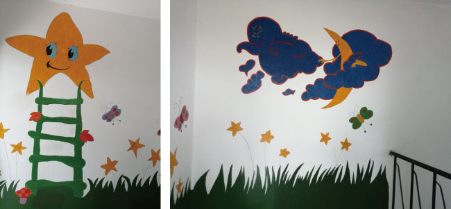 最初的墙体绘画由四名年轻女员工负责。没有绘画基础是我们最大的挑战,稍有不慎,一整面墙就得重新刷漆再画过。怀着忐忑不安的心情,我们试着完成的第一幅作品选在比较偏僻的车库入口冒厅内,乌云裹挟着弯月,草地上开着星星形状的花朵。