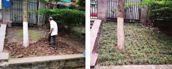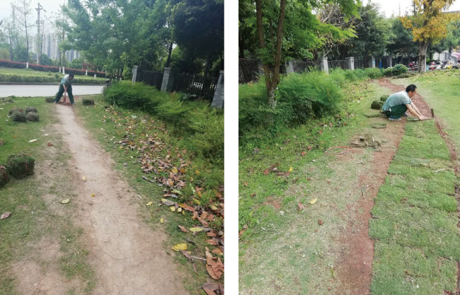 康庄美地占地面积达53.5公顷,总建筑面积约135万平方米,绿化面积约16万平方米。因小区人流量较大,且绿化无具体防护措施,绿化被人为踩踏及车辆碾压导致裸露严重,每年春秋,我项目购买大批量麦冬等植被,对园区绿化裸露等位置进行补栽,但绿化被踩踏的情况始终无法消除。