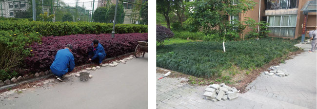 为降低绿化踩踏率,自2016年以来,我项目陆续购置大量楠竹及木桩、透水砖等,对园区内绿化增设围栏,但由于夏季高温天气,导致绿化死亡率较高。