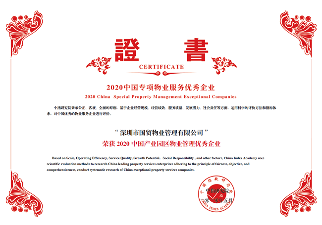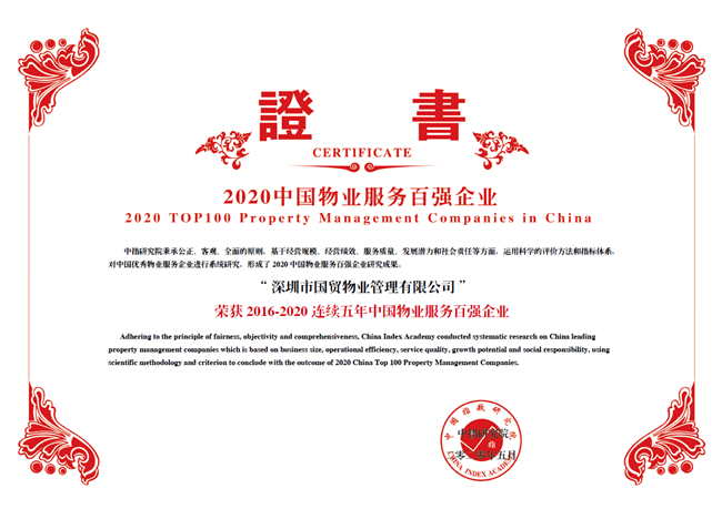 2020年5月13日,“2020中国物业服务企业百强研究成果发布会暨第十三届中国物业服务企业家峰会”在北京隆重举行。此次峰会,深圳市国贸物业管理有限公司再次荣膺“2020年中国物业服务百强企业”与“2020年中国产业园区服务优秀企业”称号,物业服务综合实力百强排名第27名。至今,国贸物业连续五年获得“中国物业服务百强企业”,进一步彰显了我司的综合实力,体现了一个老牌国企变革图强、与时俱进、勇往直前的精神本质及责任担当。