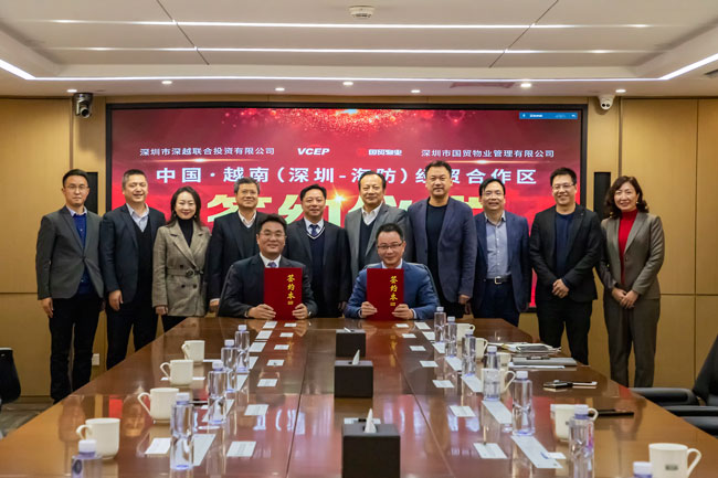 2020年12月22日下午,深越公司与国贸物业在国贸大厦39楼共同举行了-中国·越南(深圳-海防)经贸合作区物业服务项目签约仪式,国贸物业正式全面接管该经贸合作区物业服务,标志国贸物业正式跨出国门迈入海外市场,同时也标志深越公司与深物业作为深投控走向海外的系统协同正式落地。深物业集团党委书记、董事长刘声向,深越公司执行董事、总经理张小涛出席签约仪式,见证签约并致辞。