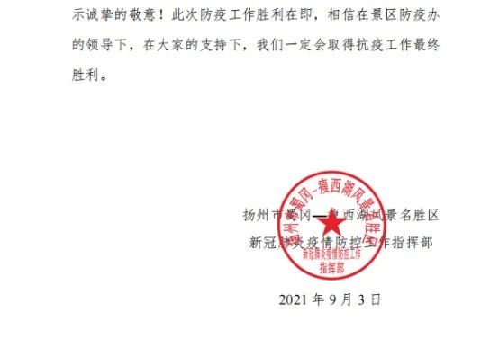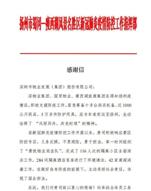 我司于2021年9月4日收到扬州市蜀岗-瘦西湖风景名胜区新冠肺炎疫情防控工作指挥部发来的感谢信,感谢信是景区领导对我们防疫工作的肯定,更是对我们社会责任感的赞许!