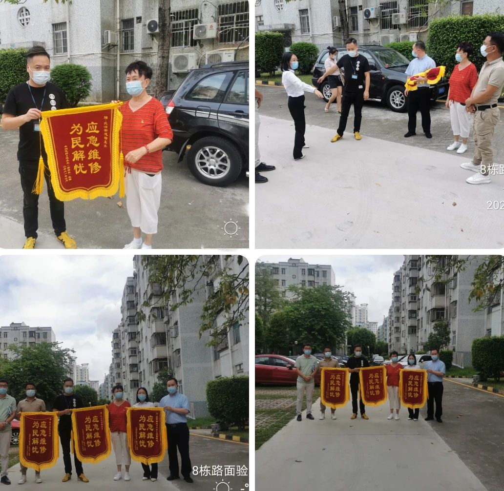 经过1个月的施工,丰润花园小区8栋路面的应急维修工程正式完工。维修进度之快,获得丰润8栋及附近几栋业主们的一致肯定。验收当天,烈日炎炎,丰润8栋的楼长的李阿姨一早便在8栋门前等候社区及街道的人员到来,将早已准备好的锦旗正式传递至验收代表的手中。同时,李阿姨代表全体居民感谢深圳市政府对深圳市居民的关注,以及管理处的全体工作人员对小区的负责。