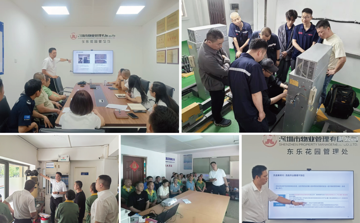 根据《方案》中“全体员工课”培训安排,国贸深物公司在完成深房光明里、深房广场、翠竹苑等多个项目培训的基础上,于东乐花园项目及下属电梯公司、清洁公司继续开展培训活动,邀请国贸深物公司安委办负责人及职能部门、专业公司人员主讲,,培训内容涵盖物业安全事故隐患及防范措施、电梯日常故障解析、电梯年度检验操作、反“三违”作业安全培训、用电安全知识。