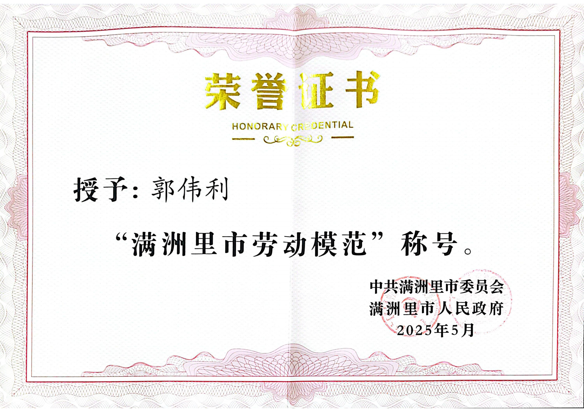 近日,在满洲里举行的表彰大会上传来喜讯,深圳市国贸物业管理有限公司满洲里分公司(以下简称“满洲里分公司”)负责人郭伟利被满洲里市委、市人民政府授予2025年“满洲里市劳动模范”称号。
