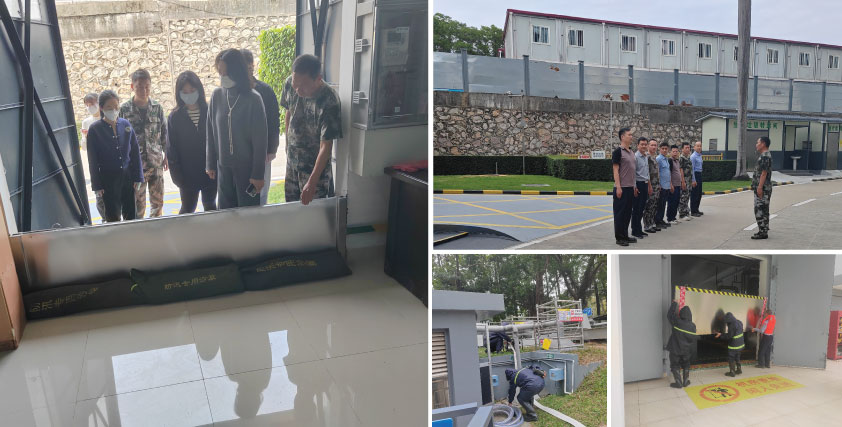 此次演练以深圳遭遇连日暴雨、生物孵化器项目水位上涨、污水站地下操作间因暴雨发生雨水倒灌为背景。项目人员接到险情报告后,即刻启动防汛应急预案,各应急小组立刻集合到位,现场应急小组、设备组换好防护服装后有序开展各项应急工作,应急小组负责安装污水站及各设备房的挡水板,并将沙袋运送至现场;设备组兵分两队,一队到现场安装抽水泵准备抽水,另一队检查各设备房设备运行情况。各小组服从指挥调度,各司其职、配合默契。