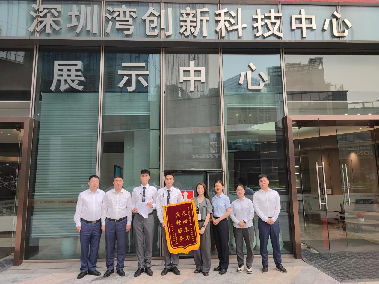 2024年4月1日下午,深圳湾创新科技中心园区企业向国贸科技园公司创新科技中心项目安管团队送上锦旗与感谢信,表达对物业工作人员应急事件处理的肯定和感激。