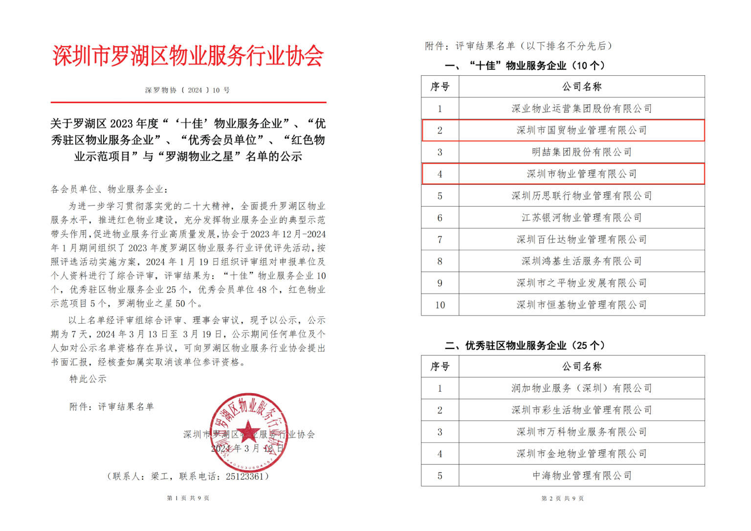 近日,深圳市罗湖区物业服务行业协会组织开展了2023年度罗湖区物业服务行业评优评先活动经过评审组对申报单位的多方面综合考量与评比。深圳市国贸物业管理有限公司(以下简称:国贸物业)及其成员单位深圳市物业管理有限公司(以下简称:国贸深物)荣获协会十佳物业服务企业称号