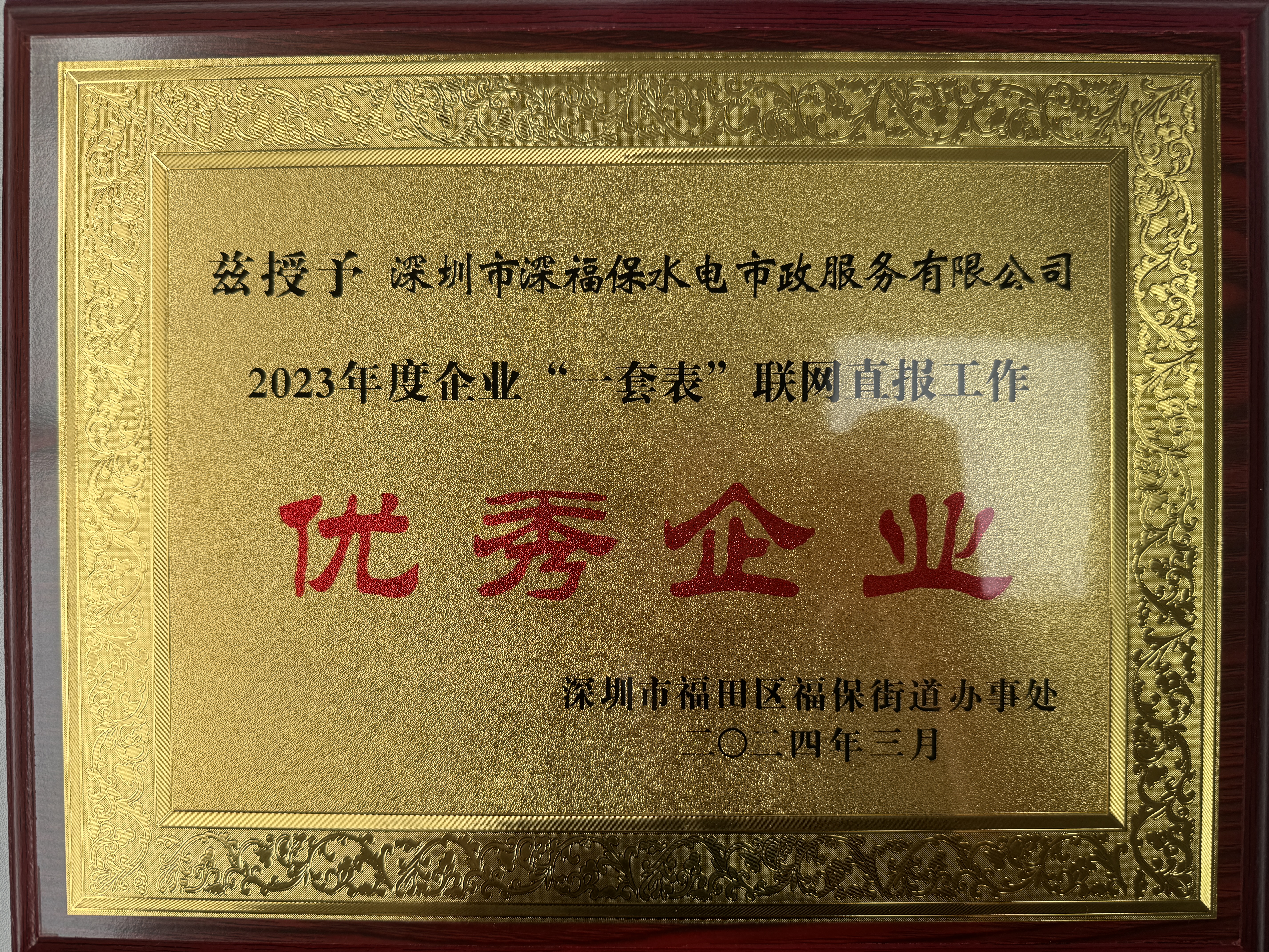 近日,国贸物业成员企业福保水电公司(以下简称“国贸福保水电”)荣获福田区福保街道“2023年度企业‘一套表’联网直报工作优秀企业”荣誉称号。