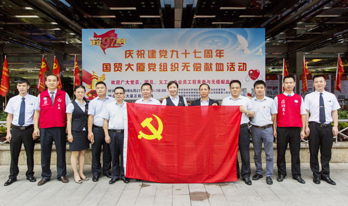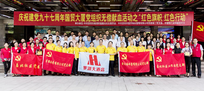 6月27日,在深圳市国贸大厦前广场举办了第七届“红色旗帜,红色行动”国贸大厦党组织无偿献血活动。活动是由中共深圳市罗湖区南湖街道办嘉北社区工作站党委、中共深圳市物业发展集团有限公司、中共深圳市国贸物业管理有限公司党委第二党支部、国贸大厦管理处等单位和社会团体,大力支持和协助下,开展的以“书记抓项目,支部创品牌,党员争先锋”为宗旨,旨在发挥党员模范作用,构建社会主义核心价值观为主题的党建公益活动。