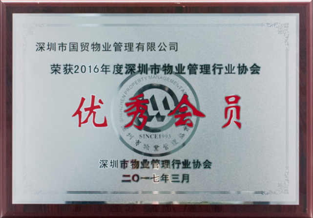 作为行业协会发起人之一,作为深物协副会长单位,国贸物业已连续多获得此项殊荣在过去的一年里,国贸物业开拓创新,规范经营,积极配合各级物业管理协会的工作和安排,认真履行企业应有的社会责任此次获得“优秀会员”称号再一次验证了国贸物业公司在行业内的品牌影响力。2017年,公司将再接再厉,不断开拓创新,在行业及协会建设中继续发挥表率作用,共同推动行业建设,促进行业健康发展。我们将以更高的姿态,去迎接新的挑战,更好的为大家服务。