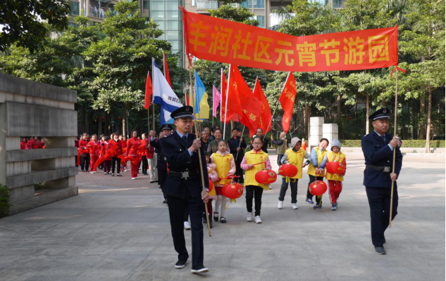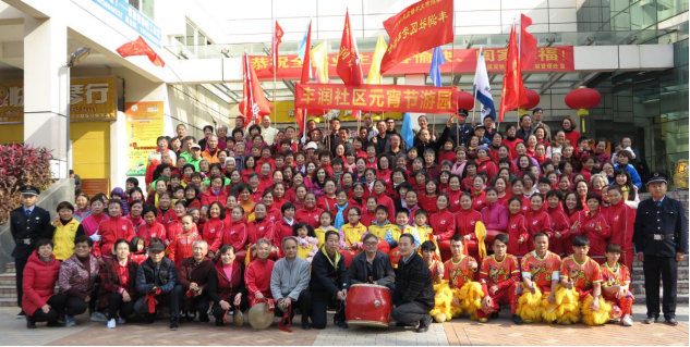 2017年2月11日上午9:00时,丰润社区里喜气洋洋,彩旗队、锣鼓队、秧歌队、腰鼓队、义工队、太极队、健身操队、群众队等三百多人组成的游园队伍浩浩荡荡地围绕社区主干道巡游,向家家户户送上元宵节的节日祝福。最后,游园队伍来到社区篮球场向居民表演了腰鼓和大鼓、红舞、舞狮。
