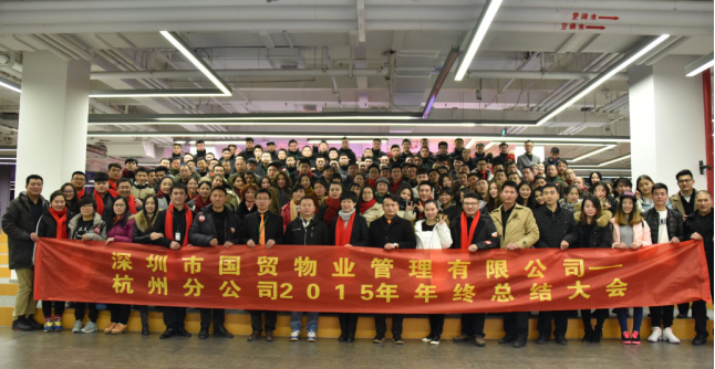 2016年1月23日16:30, 深圳市国贸物业杭州分公司2015年年度表彰大会于4-2-31白马山庄召开,出席本次会议的有国贸物业副总经理陈明勇、国贸物业杭州分公司总经理凌兰、西溪项目部副总监陈嘉星和上海圆通项目部、深圳支付宝项目部、广州淘宝网项目部、深圳一达通项目部代表以及西溪项目部各部门经理和部分员工共计200余人。