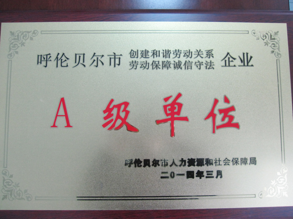 自2009年公司成立以来,公司不断发展,在用工方面更是不断加大力度,保持着诚信守法的用工原则,从而确保劳动关系的有效合法存在。 公司经过几年的发展壮大,取得了优异的成绩,得到呼伦贝尔市人力资源和社会保障局以及社会各界的充分认可,在管理规模、规范程度、服务模式、以及用工守法等方面都有了很大的发展。从而在呼伦贝尔市范围内起到了表率和示范作用。并最终成功荣获2013年度呼伦贝尔市劳动保障诚信守法A级单位。 |