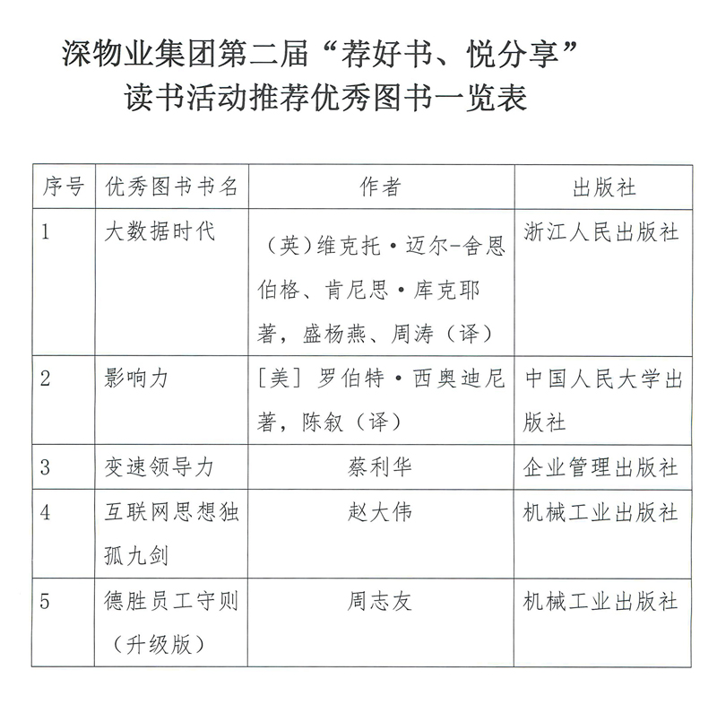 为扎实推进学习型组织建设,切实提升企业整体素质,公司按照集团要求,紧密结合企业发展和广大员工个人成长需求,于5-12月广泛深入开展第二届“好书齐分享,书香溢国贸”读书活动,树立员工爱读书、读好书、善读书、全员读书的良好学习风气,营造和树立“人人学习、终身学习”的理念,用好书引领员工成长成才,促进企业持续健康发展。 今年读书活动采取单位推荐和个人推荐相结合方式,即各单位以组织名义推荐不少于两本书,各单位员工每人可推荐不超过两本书,评选推荐前五名为本次活动的优秀图书。经过评议,最终《大数据时代》、《影响力》、《变速领导力》、《互联网思想独孤九剑》和《德胜员工守则》(升级版)5本图书入围。为促进读书活动,要求公司部门副职以上管理人员至少选读其中的两本书并撰写不少于一篇学习心得体会,普通员工至少选读其中一本书,并借助企业内刊《国贸视点》平台,刊载员工撰写的书评和读书体会。此项活动将列入年底的部门精神文明考核之中。 |