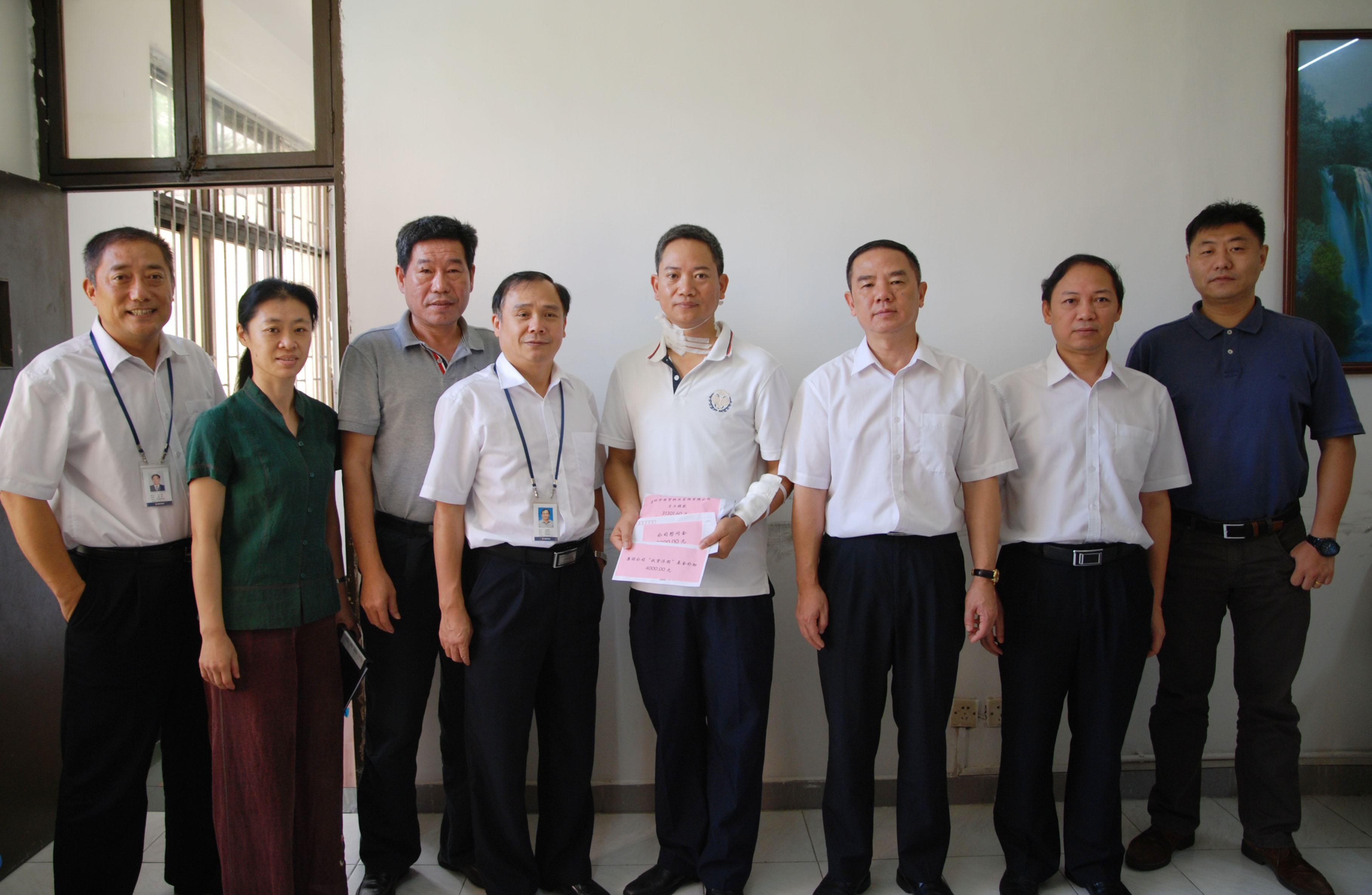 在管理处的办公室内,姚书记首先说“舒华同志是我司的优秀员工,得知你患病,大家非常着急,王总特意在领导会议上就此事作了专门部署,集团领导也很关心,从集团的扶贫济困基金中拨付了慰问金”;主管福民管理处的王副总接着说“舒华同志多年来作为车管班班长,工作获得大家一致好评,现在患病大家要多照顾,给予生活上的关心”;“现在社会传递正能量,平时你付出了,现在有了困难,我们大家会想办法为你分担,虽然我们的捐款数目不是很多,但是我们大家的一份心意,希望你保持与医院的及时沟通,配合治疗,早日康复!”总经理王总深情地说。听完几位领导的讲话,舒华动情地说“很庆幸我来到国贸物业这个大集体,感谢患病以来公司领导和单位同事对我的关心和照顾,通过手术及一个多月的治疗,感觉比以前好多了,我会积极治疗,报答公司对我的恩情”。随后,姚书记、王总、包主席分别代表集团、公司员工和公司工会的慰问金和捐款交到了舒华同志的手中!