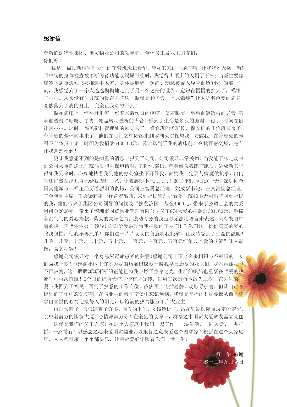 国贸新闻:2013年6月27日,我司“福民新村”管理处员工舒华,被医院确诊为慢性肾功能衰竭尿毒症。生命危在旦夕,我司领导知道后立即并在全公司范围内开展了“爱心捐款活动”。此次的“献爱心活动”得到了全体员工的积极响应。