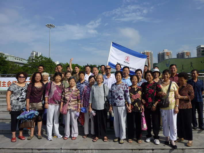 园内繁花缀景,树木郁郁葱葱,小桥流水潺潺,曲径通幽的小道,各具特色的雕塑、字画……大家兴致勃勃地四处观赏。北海银滩,福音瀑,芭蕉树下开心地留影纪念,映翠桥上喂鱼,幽幽古道上漫步,如诗如画的美景,秋高气爽的天气,老人们悠然地哼起了欢快的小曲儿,开始是三、五个人小声哼唱,随着加入的人越来越多,歌声也越来越嘹亮,最后成了壮观的五十人大合唱,引来路人的驻足观看和掌声。在大家齐心协力、相互关照下,我们一行50余人成功登上了园博园的制高点——福塔,登顶的喜悦和兴奋洋溢在每个人的脸上。在福塔上眺望四周,园博园的美景尽收眼底,南可眺深圳湾畔,北可观安托山,东可看市中心,西可赏华侨城。清爽的秋风吹散了人们的疲劳,使人顿觉身体轻快了不少,望着眼前的美景,大家纷纷感叹城市的美丽与生活中的美好。