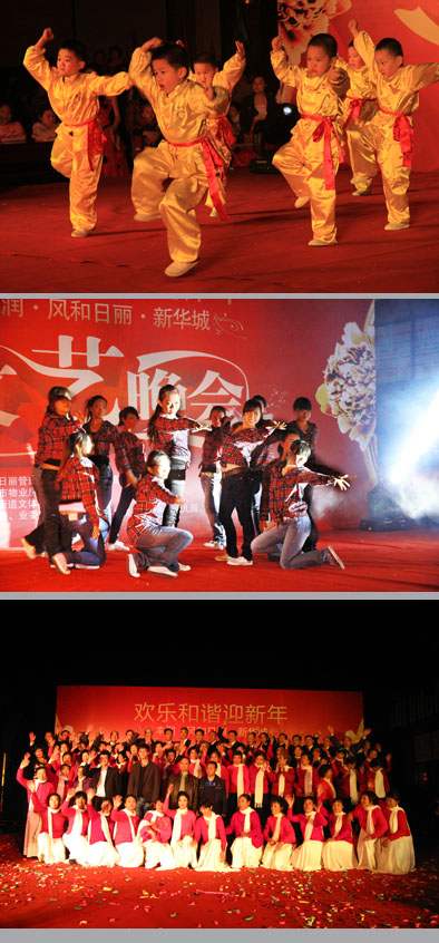 二〇一〇年十二月十九日晚上七点三十分,丰润.风和日丽.新华城的新老业主欢聚一堂,欢歌笑语,载歌载舞迎接新年。在喜庆的迎宾腰鼓声中,社区欢乐和谐迎新年文艺晚会拉开了序幕。舞蹈、歌剧舞、幼儿武术、男声小合唱、广场舞、古筝与模特秀、爵士舞、琴.舞飞扬、女声独唱、大合唱等十五个节目精彩纷呈,演出人员尽情用美妙的歌声、曼妙的舞姿传递着喜悦之情,精彩的表演不时赢得现场观众热情的掌声、喝彩声。晚会还穿插进行抽奖活动,先后抽取温馨和谐奖30名、幸福美满奖20名、魅力无限奖10名,抽奖活动给现场观众带来了惊喜,也给晚会现场增添了热闹的气氛。文艺晚会在令人流连忘返的《难忘今宵》歌声中结束。