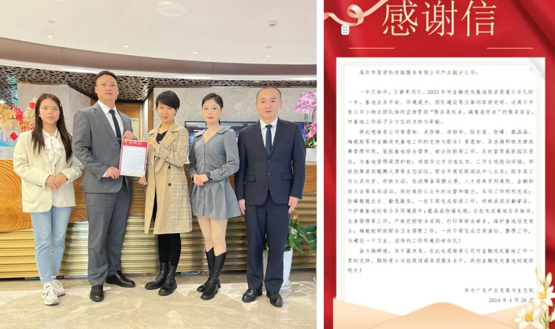 信中表示,衷心感谢小物业团队服务以来对华为鲲鹏的重视和奉献;信中强调,小物业团队在金融攻关基地的业务拓展、环境优化、团队建设等方面发挥了显著的推动作用。国贸科技园公司生态园项目三区小物业团队始终坚守岗位,秉持客户至上原则,全力以赴地为客户提供优质服务,为华为鲲鹏的发展提供坚实的后勤保障。基于前期的良好合作成果,双方将不断深化合作基础。