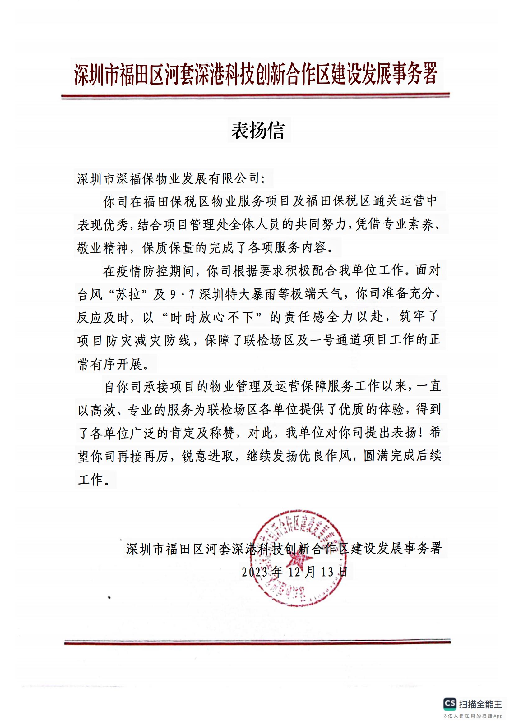 近日,国贸物业成员单位福保物业公司(以下简称:国贸福保物业)收到河套深港科技创新合作区建设发展事务署表扬信,对国贸福保物业在日常管理服务、运营保障、极端天气应对等工作中展现出的专业素养、敬业精神给予高度肯定。