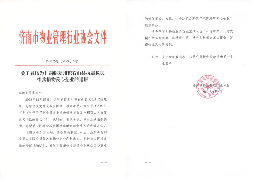 1月5日,济南市物业管理行业协会发布了《关于表扬为甘肃临夏州积石山县抗震救灾捐款捐物爱心企业的通报》,对国贸物业山东公司等29家爱心企业为甘肃积石山县抗震救灾作出积极贡献的行为提出了表扬。
