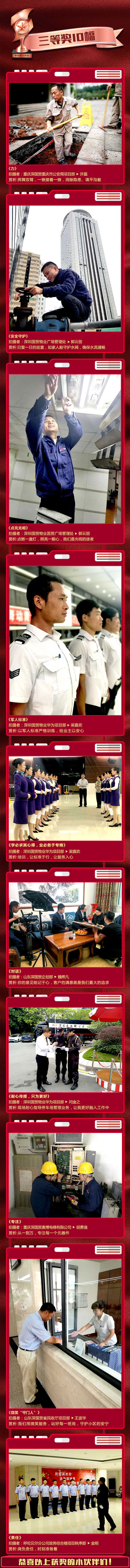本次摄影作品全都是由国贸物业在职员工拍摄,不但在内容上展现了国贸物业人的劳动精神,物业之美,同时还在主题上反映了国贸物业人恪尽职守、无私奉献的精神,记录了国贸物业人日间照料、关爱业主、服务客户的瞬间。让我们传播正能量,做“最美国贸人”!