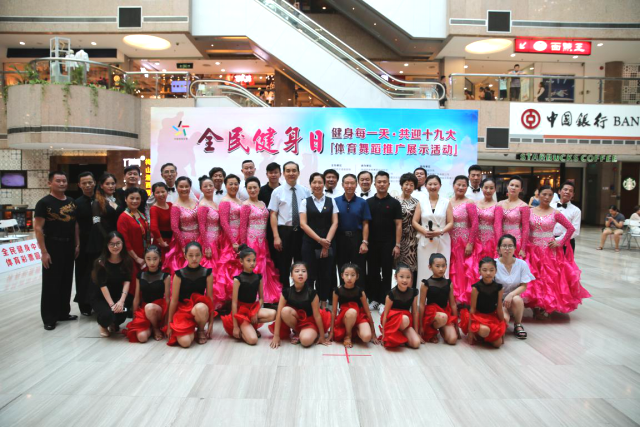 8月8日下午,在全国第九个“全民健身日”到来之际,为满足广大人民群众日益增长的健康需求,营造健身氛围,由深圳市文体旅游局主办,深圳市体育舞蹈运动协会、中共罗湖区南湖街道嘉北社区委员会、国贸物业管理有限公司党委二支部、深圳市纳艺文化传播有限公司承办,纳艺舞蹈学苑、深圳市雅加图广告有限公司、深圳市娜菲健康管理有限公司共同协办的“健身每一天,共迎十九大”全民健身主题活动在深圳市国贸大厦中厅举行。