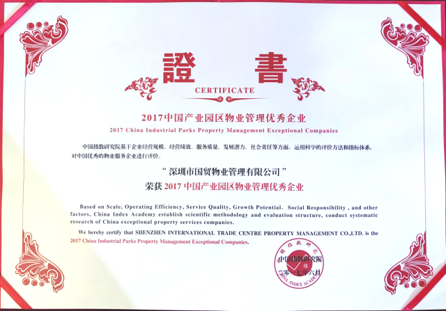 大会上发布了“2017中国物业服务百强企业”榜单,国贸物业荣膺“2017中国物业服务百强企业”全国排名第36名。同时凭借在高新产业园区物业管理方面的领先优势和服务水平,荣获“2017中国产业园区物业管理优秀企业”第4名。