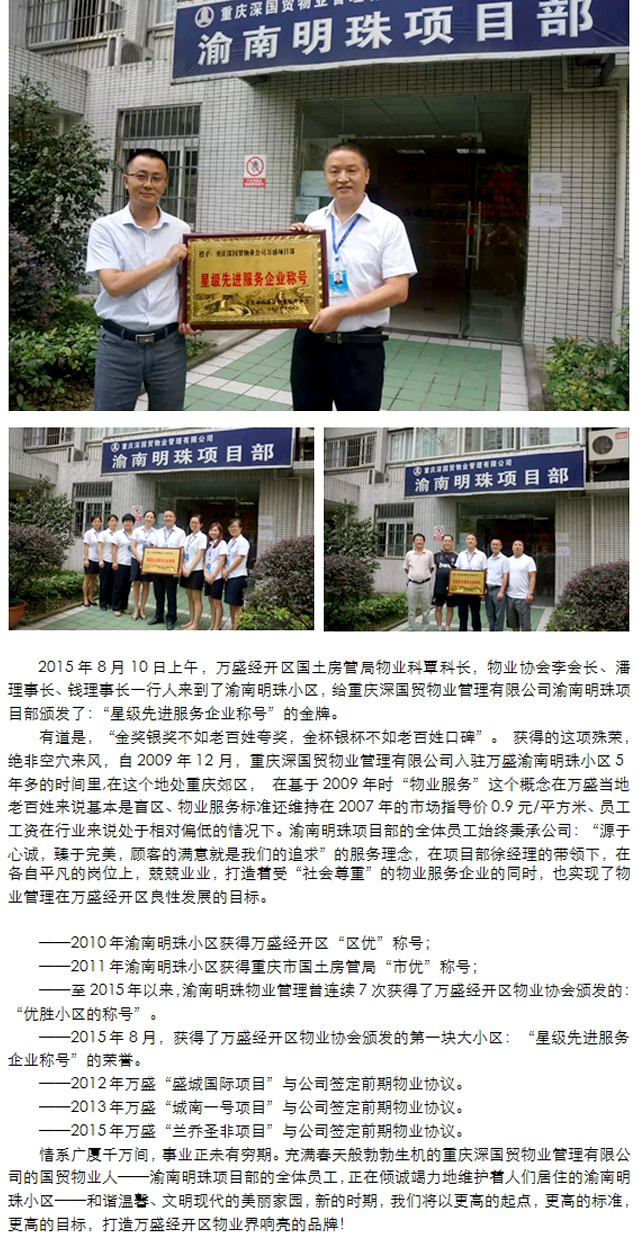 重庆深国贸渝南明珠喜获“星级先进服务企业称号”