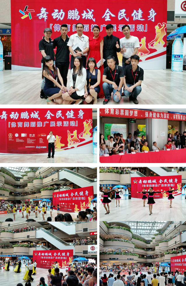 为迎接全国第六个“全民健身日”的到来,由深圳市文体旅游局主办,深圳市体育舞蹈运动协会、深圳市罗湖区南湖街道办事处、深圳市纳艺文化传播有限公司承办,罗湖区南湖街道嘉北社区工作站、深圳市国贸物业管理有限公司、深圳国贸天虹商场、深圳市纳艺服饰有限公司、深圳市雅加图广告有限公司协办的第三届“舞动鹏城,全民健身”体育舞蹈推广展示活动于2014年8月5日在深圳市国贸大厦大堂举行。国贸物业集团、罗湖区南湖街道办事处及深圳市体育舞蹈运动协会领导亲临现场参与本次活动。