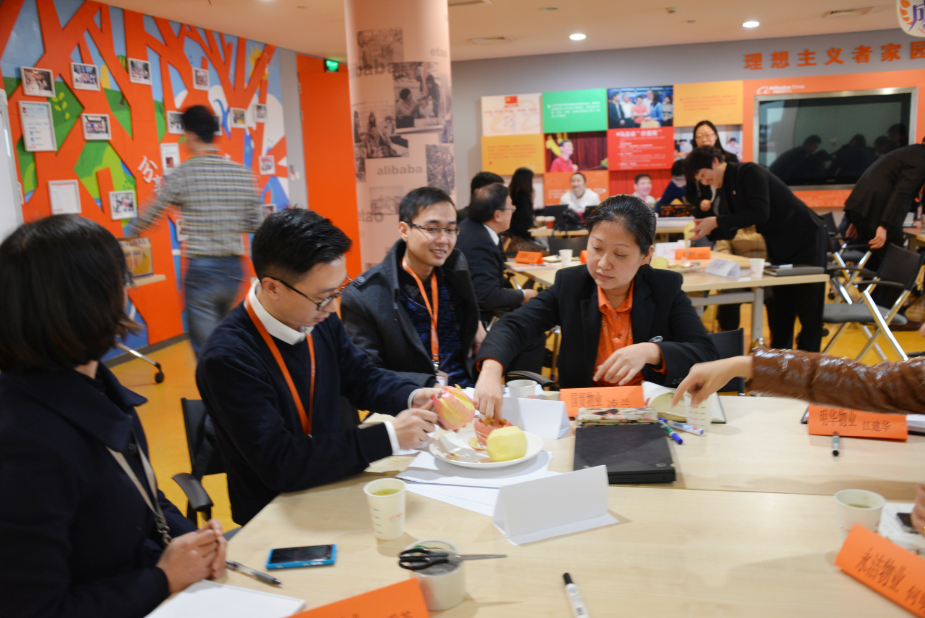 | 阿里巴巴滨江园区外景 | 团队合作游戏——平安夜团队合力削苹果 |