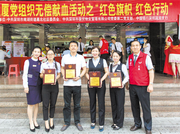 6月27日,在深圳市国贸大厦前广场举办了第七届“红色旗帜,红色行动”国贸大厦党组织无偿献血活动。活动是由中共深圳市罗湖区南湖街道办嘉北社区工作站党委、中共深圳市物业发展集团有限公司、中共深圳市国贸物业管理有限公司党委第二党支部、国贸大厦管理处等单位和社会团体,大力支持和协助下,开展的以“书记抓项目,支部创品牌,党员争先锋”为宗旨,旨在发挥党员模范作用,构建社会主义核心价值观为主题的党建公益活动。