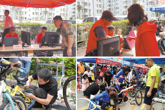 深物业集团信息中心、深圳国贸物业智能运营部的志愿者们用专业技能为居民修电脑、修手机。一位阿婆拿着两部老人手机过来心急地说:“好久没用这两部手机,开不了机,是不是坏了?”志愿者接过手机立即认真检查,并告诉阿婆:“奶奶,你的手机应该长按这个键开机。两部手机都能开机,只是一部没有插通讯卡,另一部手机可能欠费了。”志愿者一遍又一遍耐心地教会阿婆如何操作。
