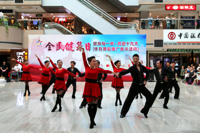 8月8日下午,在全国第九个“全民健身日”到来之际,为满足广大人民群众日益增长的健康需求,营造健身氛围,由深圳市文体旅游局主办,深圳市体育舞蹈运动协会、中共罗湖区南湖街道嘉北社区委员会、国贸物业管理有限公司党委二支部、深圳市纳艺文化传播有限公司承办,纳艺舞蹈学苑、深圳市雅加图广告有限公司、深圳市娜菲健康管理有限公司共同协办的“健身每一天,共迎十九大”全民健身主题活动在深圳市国贸大厦中厅举行。