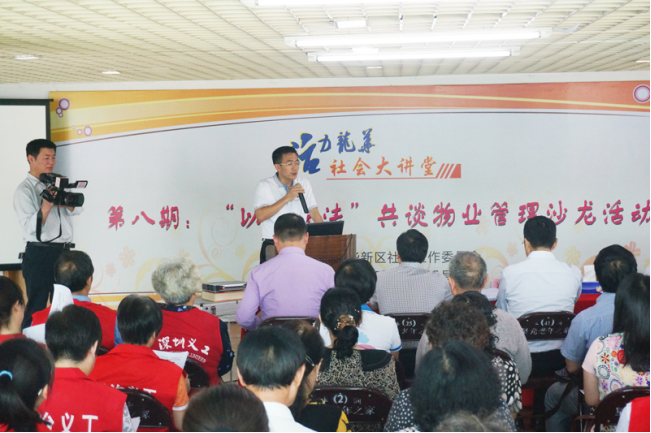 2014年4月28日下午三时,龙华新区“活力龙华”社会大讲堂第八期活动——“‘以案说法’共谈物业管理沙龙”在风和日丽小区生活馆三楼举行。物业行业的专家、志愿宣讲师、义工代表、物业公司代表以及业主委员会代表共聚一堂,共同探讨和交流物业管理。