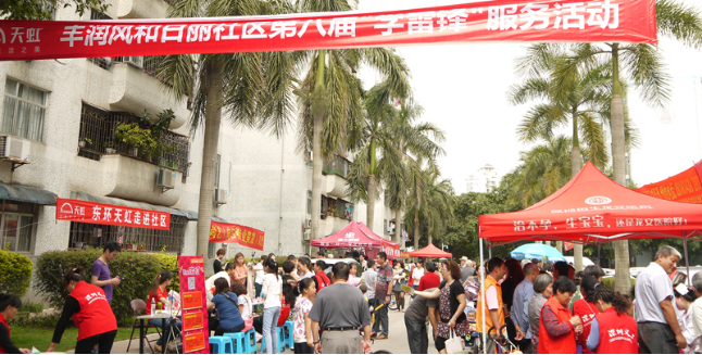 丰润风和日丽管理处邀请了深圳恒生龙安医院、安琪盲人按摩机构、尚艺向日葵美容美发连锁店、东环天虹商场、博士眼镜、深圳福田银座村镇银行、精诚华维公司及社区党支部、居委会、业委会、老年协会、关工委、义工队等十多家单位为小区居民免费提供了义诊、盲人按摩、拔火罐、剪发、盘头发、化妆、修眉、金银首饰清洗、熨烫衣服、真伪钞识别、眼镜维修和清洗、维护电脑、家电维修、水电维修、办理老年人乘车证、办理居住证、计生服务和理财咨询,同时开展了禁烟条例与垃圾不落地的宣传,进行义工招募等。这些志愿服务活动吸引了广大居民的浓厚兴趣,大家纷纷驻足停留,享受不出家门的便民服务,得到居民的点赞和喜爱。