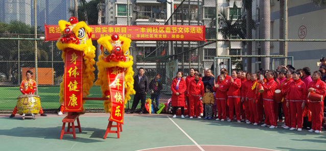 2017年2月11日上午9:00时,丰润社区里喜气洋洋,彩旗队、锣鼓队、秧歌队、腰鼓队、义工队、太极队、健身操队、群众队等三百多人组成的游园队伍浩浩荡荡地围绕社区主干道巡游,向家家户户送上元宵节的节日祝福。最后,游园队伍来到社区篮球场向居民表演了腰鼓和大鼓、红舞、舞狮。