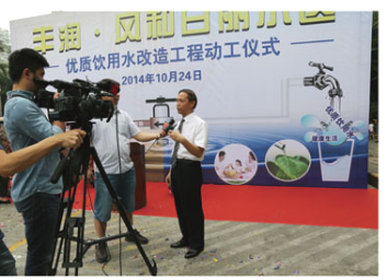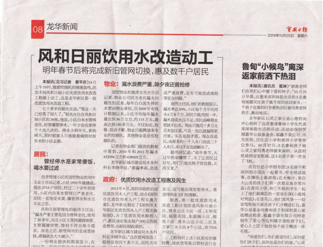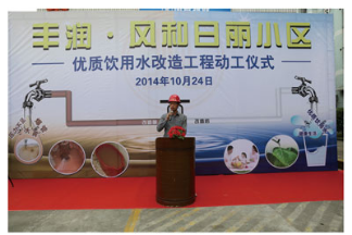 2014年10月24日上午,风和日丽小区2754户业主敲锣打鼓,喜气洋洋迎来了期盼已久的“丰润·风和日丽小区优质饮用水工程动工仪式”。龙华新区城市建设局、深圳市深水龙华水务有限公司、深圳市华茂建设有限公司、丰润社区党支部、丰润社区居委会、风和日丽业主委员会等社区组织和领导出席了动工仪式。同时深圳电视台第一现场、南方都市报、深圳商报、宝安电视台、宝安日报共五家媒体对仪式进行了报道。