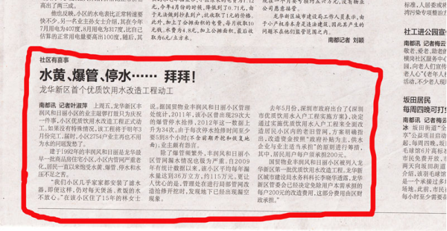 5.国贸物业管理有限公司副总经理王文浩接受记者访问的时候说:小区管网问题困扰了2754户居民,也困扰了管理公司7年之久。为了解决我们丰润·风和日丽小区管网问题,国贸物业所做的工作可以用“排除艰辛,永不放弃”来形容。从2010年开始,国贸物业风和日丽管理处先后去函给龙华自来水公司、当时的宝安区房屋共用设施维修基金管理中心、深圳市物业专项维修资金管理中心,寻求解决途径。深圳市自来水公司的回函是:根据《物权法》第七十二条规定,小区管网属全体业主共有,理应由全体业主负责。深圳市物业专项维修资金管理中心的回函是:根据《广东省物业管理条例》第六十一条第二款规定:“物业管理区域内依法应当由供水、供电、供气、供热、通讯、有线电视等单位承担的相关管线和设施设备的维修、养护费用,不得从住宅专项维修资金中列支。”2012年3月26日,宝安区兼龙华新区书记鲁毅书记前来社区调研,国贸物业联合社区向鲁毅书记反应了管网水质等问题。2012年3月29日,国贸物业联合社区组织共同向民治办事处报告小区管网水质等问题,回函表示无政策支持。此外,国贸物业向开发商深物业集团公司汇报,提出一些解决方案,但终因资金缺口太大,未能得以解决。在此过程中,国贸物业也曾多次组织管网局部修缮,对部分锈蚀严重的管道和阀门进行更换等。在2011年7月,国贸物业专门从广州聘请专业的管道测漏公司对小区管网进行全面测漏并修补,共耗资约60万元,减缓水黄的严重性,降低了爆管抢修给居民带来的不便,但杯水车薪,仍然无法解决根本问题。