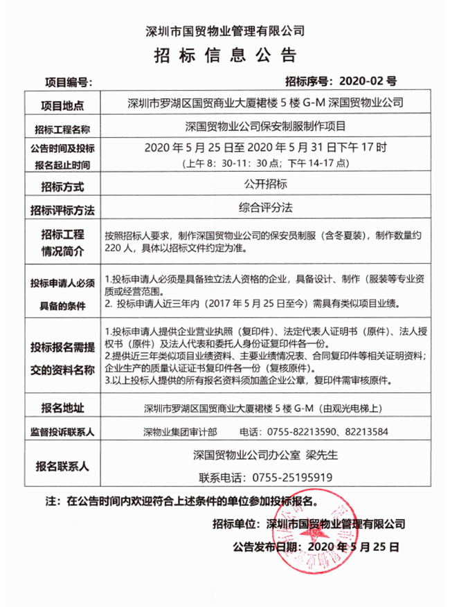 深圳市国贸物业有限公司保安制服制作项目招标信息公告