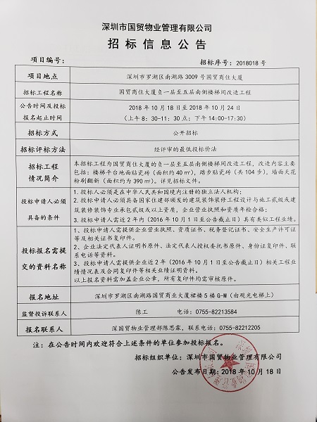 国贸商住大厦负一层至五层南侧楼梯间改造工程招标公告