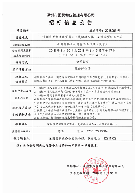 深国贸物业公司员工工作服(夏装)招标公告