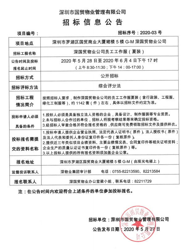 国贸物业员工工作服(夏装)招标公告