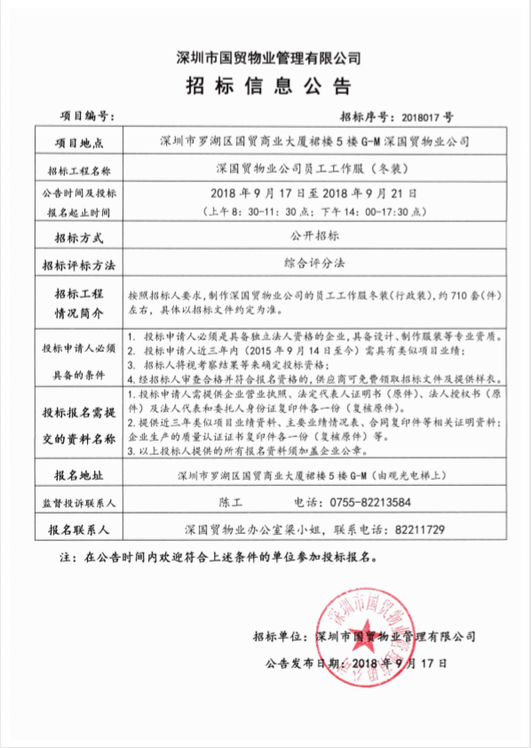 深国贸物业公司员工工作服(冬装)招标公告